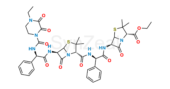 Piperacillin Impurity 4 is chemically Ethyl (2S,6R)-6-((2R)-2-((2S,6R)-6-((R)-2-(4-ethyl-2,3-dioxopiperazine-1-carboxamido)-2-phenylacetamido)-3,3-dimethyl-7-oxo-4-thia-1-azabicyclo[3.2.0]heptane-2-carboxamido)-2-phenylacetamido)-3,3-dimethyl-7-oxo-4-thia-1-azabicyclo[3.2.0]heptane-2-carboxylate. Piperacillin Impurity 4 is supplied with detailed characterization data compliant with regulatory guideline. Piperacillin Impurity 4 can be used for the analytical method development, method validation (AMV), Quality Controlled (QC) application for Abbreviated New Drug Application (ANDA) or during commercial production of Piperacillin.
