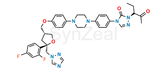 Posaconazole Impurity 10 is chemically 4-(4-(4-(4-(((3R,5R)-5-((1H-1,2,4-triazol-1-yl)methyl)-5-(2,4-difluorophenyl)tetrahydrofuran-3-yl)methoxy)phenyl)piperazin-1-yl)phenyl)-2-((R)-2-oxopentan-3-yl)-2,4-dihydro-3H-1,2,4-triazol-3-one. Posaconazole Impurity 10 is supplied with detailed characterization data compliant with regulatory guideline. Posaconazole Impurity 10 can be used for the analytical method development, method validation (AMV), Quality Controlled (QC) application for Abbreviated New Drug Application (ANDA) or during commercial production of Posaconazole.