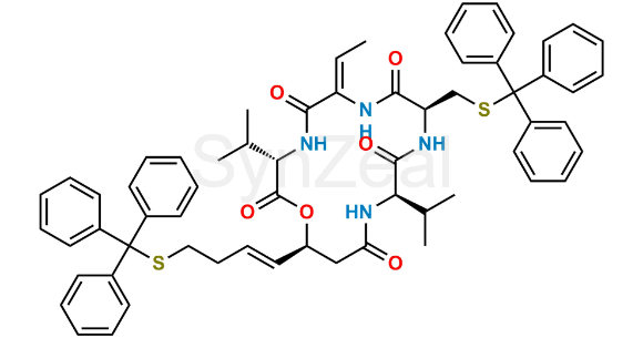 Romidepsin Di-S-trityl impurity is chemically (3S,9S,12R,16S,Z)-6-ethylidene-3,12-diisopropyl-16-((E)-4-(tritylthio) but-1-en-1-yl)-9-((tritylthio)methyl)-1-oxa-4,7,10,13-tetraazacyclohexadecane-2,5,8,11,14-pentaone. Romidepsin Di-S-trityl impurity is supplied with detailed characterization data compliant with regulatory guideline. Romidepsin Di-S-trityl impurity can be used for the analytical method development, method validation (AMV), Quality Controlled (QC) application for Abbreviated New Drug Application (ANDA) or during commercial production of Romidepsin.