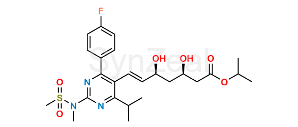 Rosuvastatin Acid Isopropyl Ester is chemically (3R,5S,6E)-7-[4-(4-Fluorophenyl)-6-(1-methylethyl)-2-(methyl-methylsulfonyl-amino)-pyrimidin-5-yl]-3,5-dihydroxy-hept-6-enoic acid isopropyl ester. Rosuvastatin Acid Isopropyl Ester is supplied with detailed characterization data compliant with regulatory guideline. Rosuvastatin Acid Isopropyl Ester can be used for the analytical method development, method validation (AMV), Quality Controlled (QC) application for Abbreviated New Drug Application (ANDA) or during commercial production of Rosuvastatin.