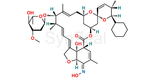 Selamectin EP Impuity B is chemically (2aE,2′S,4E,5′S,6S,6′R,7S,8E,11R,15S,17aR,20Z,20aR,20bS)-6′-Cyclohexyl-7-[(2,6-dideoxy-3-O-methyl-α-L-arabino-hexopyranosyl)oxy]-20b-hydroxy-20-(hydroxyimino)-5′,6,8,19-tetramethyl-5′,6,6′,7,10,11,14,15,17a,20,20a,20b-dodecahydrospiro[2H,17H-11,15-methanofuro[4,3,2-pq][2,6]benzodioxacyclooctadecine-13,2′-pyran]-17-one ((5Z,25R)-25-cyclohexyl-4′-O-de(2,6-dideoxy-3-O-methyl-α-L-arabino-hexopyranosyl)-5-demethoxy-25-de(1-methylpropyl)-5-(hydroxyimino)avermectin A1a). Selamectin EP Impuity B is supplied with detailed characterization data compliant with regulatory guideline. Selamectin EP Impuity B can be used for the analytical method development, method validation (AMV), Quality Controlled (QC) application for Abbreviated New Drug Application (ANDA) or during commercial production of Selamectin.