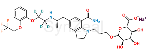 Silodosin-D4 β-D-Glucuronide Sodium Salt is chemically Sodium (2S,3S,4S,5R,6R)-6-(3-(7-carbamoyl-5-((R)-2-((2-(2-(2,2,2-trifluoroethoxy)phenoxy)ethyl-1,1,2,2-d4)amino)propyl)indolin-1-yl)propoxy)-3,4,5-trihydroxytetrahydro-2H-pyran-2-carboxylate. Silodosin-D4 β-D-Glucuronide Sodium Salt is supplied with detailed characterization data compliant with regulatory guideline. Silodosin-D4 β-D-Glucuronide Sodium Salt can be used for the analytical method development, method validation (AMV), Quality Controlled (QC) application for Abbreviated New Drug Application (ANDA) or during commercial production of Silodosin.
