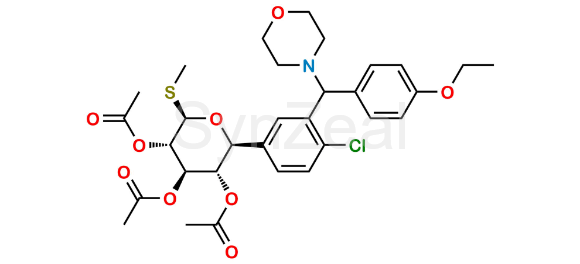 Sotagliflozin 3,4,5-triacetate Morpholine Impurity is chemically (2S,3S,4R,5S,6R)-2-(4-chloro-3-((4-ethoxyphenyl)(morpholino)methyl)phenyl)-6-(methylthio)tetrahydro-2H-pyran-3,4,5-triyl triacetate. Sotagliflozin 3,4,5-triacetate Morpholine Impurity is supplied with detailed characterization data compliant with regulatory guideline. Sotagliflozin 3,4,5-triacetate Morpholine Impurity can be used for the analytical method development, method validation (AMV), Quality Controlled (QC) application for Abbreviated New Drug Application (ANDA) or during commercial production of Sotagliflozin.