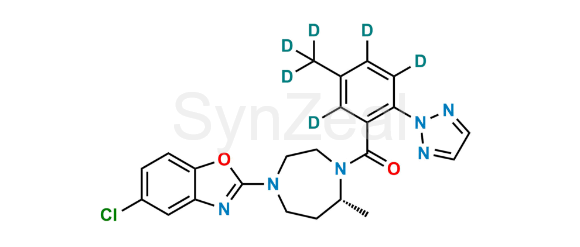 Suvorexant-d6 is chemically (R)-(4-(5-chlorobenzo[d]oxazol-2-yl)-7-methyl-1,4-diazepan-1-yl)(5-(methyl-d3)-2-(2H-1,2,3-triazol-2-yl)phenyl-3,4,6-d3)methanone. Suvorexant-d6 is supplied with detailed characterization data compliant with regulatory guideline. Suvorexant-d6 can be used for the analytical method development, method validation (AMV), Quality Controlled (QC) application for Abbreviated New Drug Application (ANDA) or during commercial production of Suvorexant.