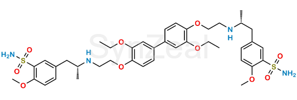 Tamsulosin Dimer Impurity 1 is chemically 5,5'-((2R,2'R)-((((3,3'-Diethoxy-[1,1'-biphenyl]-4,4'-diyl)bis(oxy))bis(ethane-2,1-diyl))bis(azanediyl))bis(propane-2,1-diyl))bis(2-methoxybenzenesulfonamide). Tamsulosin Dimer Impurity 1 is supplied with detailed characterization data compliant with regulatory guideline. Tamsulosin Dimer Impurity 1 can be used for the analytical method development, method validation (AMV), Quality Controlled (QC) application for Abbreviated New Drug Application (ANDA) or during commercial production of Tamsulosin.