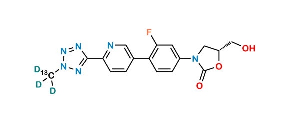 Tedizolid-13C,D3 is chemically (R)-3-(3-fluoro-4-(6-(2-(methyl-13C-d3)-2H-tetrazol-5-yl)pyridin-3-yl)phenyl)-5-(hydroxymethyl)oxazolidin-2-one. Tedizolid-13C,D3 is supplied with detailed characterization data compliant with regulatory guideline. Tedizolid-13C,D3 can be used for the analytical method development, method validation (AMV), Quality Controlled (QC) application for Abbreviated New Drug Application (ANDA) or during commercial production of Tedizolid.