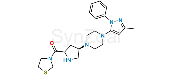 Teneligliptin Impurity 35 is chemically ((2S,4R)-4-(4-(3-methyl-1-phenyl-1H-pyrazol-5-yl)piperazin-1-yl)pyrrolidin-2-yl)(thiazolidin-3-yl)methanone. Teneligliptin Impurity 35 is supplied with detailed characterization data compliant with regulatory guideline. Teneligliptin Impurity 35 can be used for the analytical method development, method validation (AMV), Quality Controlled (QC) application for Abbreviated New Drug Application (ANDA) or during commercial production of Teneligliptin.
