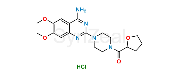 Terazosin HCl is chemically [4-(4-Amino-6,7-dimethoxyquinazolin-2-yl)piperazin-1-yl][(2RS)-oxolan-2-yl]methanone hydrochloride (as per EP) ; 1-(4-Amino-6,7-dimethoxy-2-quinazolinyl)-4-(tetrahydro-2-furoyl)piperazine monohydrochloride (as per USP). Terazosin HCl is supplied with detailed characterization data compliant with regulatory guideline. Terazosin HCl can be used for the analytical method development, method validation (AMV), Quality Controlled (QC) application for Abbreviated New Drug Application (ANDA) or during commercial production of Terazosin.