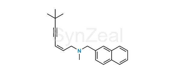 Terbinafine EP Impurity F is chemically (2Z)-N,6,6-trimethyl-N-(naphthalen-2-ylmethyl)hept-2-en-4-yn-1-amine (as per EP). It is also known as cis-Isoterbinafine (EP). Terbinafine EP Impurity F is supplied with detailed characterization data compliant with regulatory guideline. Terbinafine EP Impurity F can be used for the analytical method development, method validation (AMV), Quality Controlled (QC) application for Abbreviated New Drug Application (ANDA) or during commercial production of Terbinafine .