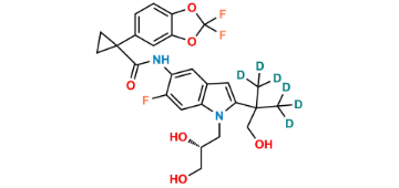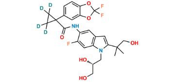 Tezacaftor D4 is chemically (R)-1-(2,2-difluorobenzo[d][1,3]dioxol-5-yl)-N-(1-(2,3-dihydroxypropyl)-6-fluoro-2-(1-hydroxy-2-methylpropan-2-yl)-1H-indol-5-yl)cyclopropane-2,2,3,3-d4-1-carboxamide. Tezacaftor D4 is supplied with detailed characterization data compliant with regulatory guideline. Tezacaftor D4 can be used for the analytical method development, method validation (AMV), Quality Controlled (QC) application for Abbreviated New Drug Application (ANDA) or during commercial production of Tezacaftor.
