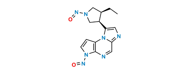 Upadacitinib Nitroso Impurity 3 is chemically 8-((3R,4S)-4-ethyl-1-nitrosopyrrolidin-3-yl)-3-nitroso-3H-imidazo[1,2-a]pyrrolo[2,3-e]pyrazine. Upadacitinib Nitroso Impurity 3 is supplied with detailed characterization data compliant with regulatory guideline. Upadacitinib Nitroso Impurity 3 can be used for the analytical method development, method validation (AMV), Quality Controlled (QC) application for Abbreviated New Drug Application (ANDA) or during commercial production of Upadacitinib.