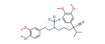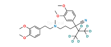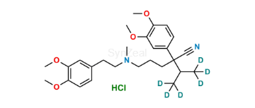 Verapamil D6 is chemically 5-((3,4-Dimethoxyphenethyl)(methyl)amino)-2-(3,4-dimethoxyphenyl)-2-(propan-2-yl-1,1,1,3,3,3-d6)pentanenitrile hydrochloride. Verapamil D6 is supplied with detailed characterization data compliant with regulatory guideline. Verapamil D6 can be used for the analytical method development, method validation (AMV), Quality Controlled (QC) application for Abbreviated New Drug Application (ANDA) or during commercial production of Verapamil.