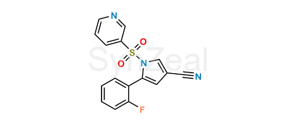 Vonoprazan Impurity 37 is chemically 5-(2-Fluorophenyl)-1-(pyridin-3-ylsulfonyl)-1H-pyrrole-3-carbonitrile. Vonoprazan Impurity 37 is supplied with detailed characterization data compliant with regulatory guideline. Vonoprazan Impurity 37 can be used for the analytical method development, method validation (AMV), Quality Controlled (QC) application for Abbreviated New Drug Application (ANDA) or during commercial production of Vonoprazan.