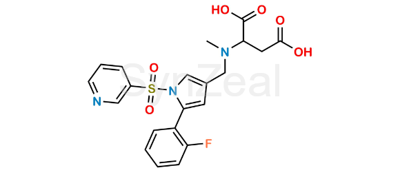 Vonoprazan Impurity 38 is chemically N-((5-(2-Fluorophenyl)-1-(pyridin-3-ylsulfonyl)-1H-pyrrol-3-yl)methyl)-N-methylaspartic acid. Vonoprazan Impurity 38 is supplied with detailed characterization data compliant with regulatory guideline. Vonoprazan Impurity 38 can be used for the analytical method development, method validation (AMV), Quality Controlled (QC) application for Abbreviated New Drug Application (ANDA) or during commercial production of Vonoprazan.
