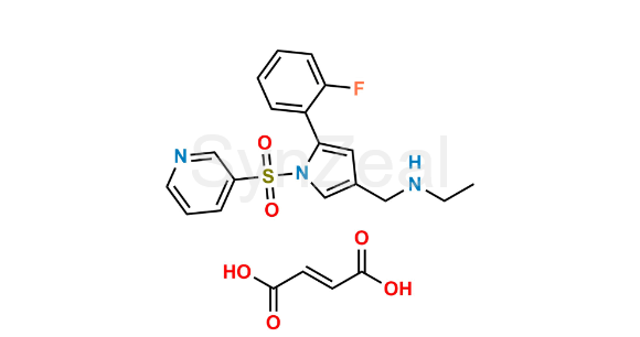 Vonoprazan Impurity 45 is chemically N-((5-(2-Fluorophenyl)-1-(pyridin-3-ylsulfonyl)-1H-pyrrol-3-yl)methyl)ethanamine fumarate. Vonoprazan Impurity 45 is supplied with detailed characterization data compliant with regulatory guideline. Vonoprazan Impurity 45 can be used for the analytical method development, method validation (AMV), Quality Controlled (QC) application for Abbreviated New Drug Application (ANDA) or during commercial production of Vonoprazan.