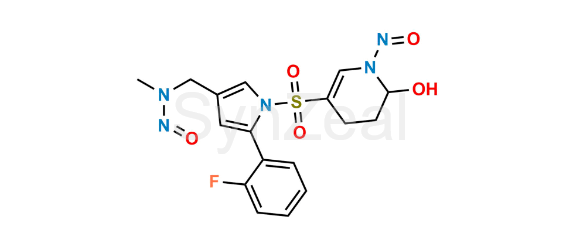 Vonoprazan Nitroso Impurity 4 is chemically N-((5-(2-Fluorophenyl)-1-((6-hydroxy-1-nitroso-1,4,5,6-tetrahydropyridin-3-yl)sulfonyl)-1H-pyrrol-3-yl)methyl)-N-methylnitrous amide. Vonoprazan Nitroso Impurity 4 is supplied with detailed characterization data compliant with regulatory guideline. Vonoprazan Nitroso Impurity 4 can be used for the analytical method development, method validation (AMV), Quality Controlled (QC) application for Abbreviated New Drug Application (ANDA) or during commercial production of Vonoprazan.