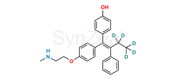 (Z)-4-Hydroxy-N-Desmethyl Tamoxifen D5 is chemically (Z)-4-(1-(4-(2-(methylamino)ethoxy)phenyl)-2-phenylbut-1-en-1-yl-3,3,4,4,4-d5)phenol. It is also known as Endoxifen-D5. (Z)-4-Hydroxy-N-Desmethyl Tamoxifen D5 is supplied with detailed characterization data compliant with regulatory guideline. (Z)-4-Hydroxy-N-Desmethyl Tamoxifen D5 can be used for the analytical method development, method validation (AMV), Quality Controlled (QC) application for Abbreviated New Drug Application (ANDA) or during commercial production of Tamoxifen.