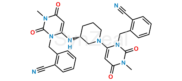 Alogliptin Benzoate Dimer Impurity is chemically (R)-2-((6-(3-((3-(2-cyanobenzyl)-1-methyl-2,6-dioxo-1,2,3,6-tetrahydropyrimidin-4-yl)amino)piperidin-1-yl)-3-methyl-2,4-dioxo-3,4-dihydropyrimidin-1(2H)-yl)methyl)benzonitrile. Alogliptin Benzoate Dimer Impurity is supplied with detailed characterization data compliant with regulatory guideline. Alogliptin Benzoate Dimer Impurity can be used for the analytical method development, method validation (AMV), Quality Controlled (QC) application for Abbreviated New Drug Application (ANDA) or during commercial production of Alogliptin.