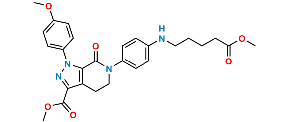 Apixaban Impurity 153 is chemically Methyl 6-(4-((5-methoxy-5-oxopentyl)amino)phenyl)-1-(4-methoxyphenyl)-7-oxo-4,5,6,7-tetrahydro-1H-pyrazolo[3,4-c]pyridine-3-carboxylate. Apixaban Impurity 153 is supplied with detailed characterization data compliant with regulatory guideline. Apixaban Impurity 153 can be used for the analytical method development, method validation (AMV), Quality Controlled (QC) application for Abbreviated New Drug Application (ANDA) or during commercial production of Apixaban.