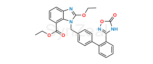 Azilsartan Ethyl Impurity is chemically Ethyl 2-ethoxy-1-((2'-(5-oxo-4,5-dihydro-1,2,4-oxadiazol-3-yl)-[1,1'-biphenyl]-4-yl)methyl)-1H-benzo[d]imidazole-7-carboxylate. Azilsartan Ethyl Impurity is supplied with detailed characterization data compliant with regulatory guideline. Azilsartan Ethyl Impurity can be used for the analytical method development, method validation (AMV), Quality Controlled (QC) application for Abbreviated New Drug Application (ANDA) or during commercial production of Azilsartan.