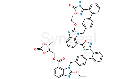 Azilsartan Medoxomil Dimer Impurity is chemically (5-Methyl-2-oxo-1,3-dioxol-4-yl)methyl 2-ethoxy-1-((2'-(5-(2-ethoxy-1-((2'-(5-oxo-4,5-dihydro-1,2,4-oxadiazol-3-yl)-[1,1'-biphenyl]-4-yl)methyl)-1H-benzo[d]imidazol-7-yl)-1,2,4-oxadiazol-3-yl)-[1,1'-biphenyl]-4-yl)methyl)-1H-benzo[d]imidazole-7-carboxylate. Azilsartan Medoxomil Dimer Impurity is supplied with detailed characterization data compliant with regulatory guideline. Azilsartan Medoxomil Dimer Impurity can be used for the analytical method development, method validation (AMV), Quality Controlled (QC) application for Abbreviated New Drug Application (ANDA) or during commercial production of Azilsartan Medoxomil.