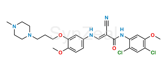 Bosutinib Impurity II is chemically 2-Cyano-N-(2,4-dichloro-5-methoxy phenyl)-3-{4-methoxy-3-[3-(4-methyl piperazin-1-yl)-propoxy]- phenylamino} acrylamide. Bosutinib Impurity II is supplied with detailed characterization data compliant with regulatory guideline. Bosutinib Impurity II can be used for the analytical method development, method validation (AMV), Quality Controlled (QC) application for Abbreviated New Drug Application (ANDA) or during commercial production of Bosutinib.