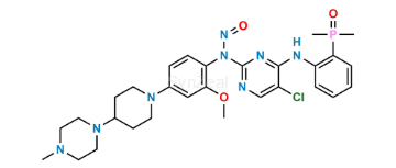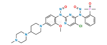 Brigatinib Nitroso Impurity 2 is chemically N-(5-Chloro-2-((2-methoxy-4-(4-(4-methylpiperazin-1-yl)piperidin-1-yl)phenyl)amino)pyrimidin-4-yl)-N-(2-(dimethylphosphoryl)phenyl)nitrous amide. Brigatinib Nitroso Impurity 2 is supplied with detailed characterization data compliant with regulatory guideline. Brigatinib Nitroso Impurity 2 can be used for the analytical method development, method validation (AMV), Quality Controlled (QC) application for Abbreviated New Drug Application (ANDA) or during commercial production of Brigatinib.