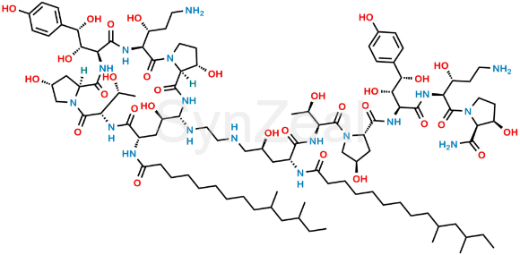 Chemical Name: (2S,4R)-N-((2S,3S,4S)-1-(((2S,3R)-5-Amino-1-((2S,3R)-2-carbamoyl-3-hydroxypyrrolidin-1-yl)-3-hydroxy-1-oxopentan-2-yl)amino)-3,4-dihydroxy-4-(4-hydroxyphenyl)-1-oxobutan-2-yl)-1-(((2R,4S)-5-((2-(((2R,6S,9S,11R,12S,14aS,15S,20S,23S,25aS)-20-((R)-3-amino-1-hydroxypropyl)-23-((1S,2S)-1,2-dihydroxy-2-(4-hydroxyphenyl)ethyl)-9-(10,12-dimethyltetradecanamido)-2,11,15-trihydroxy-6-((R)-1-hydroxyethyl)-5,8,14,19,22,25-hexaoxotetracosahydro-1H-dipyrrolo[2,1-c:2',1'-l][1,4,7,10,13,16]hexaazacyclohenicosin-12-yl)amino)ethyl)amino)-2-(10,12-dimethyltetradecanamido)-4-hydroxypentanoyl)-L-threonyl)-4-hydroxypyrrolidine-2-carboxamide
