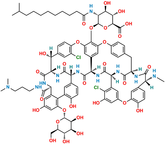 Smiles: O=C1[C@](NC([C@](C2=CC(C3=C(O[C@H]4O[C@H](CO)[C@@H](O)[C@H](O)[C@@H]4O)C=C(O)C=C3[C@@H](C(NCCCN(C)C)=O)N1)=C(O)C=C2)([H])NC([C@]5([H])NC([C@@](C6=C(Cl)C(O)=CC(OC7=C(O)C=CC([C@](NC)([H])C8=O)=C7)=C6)([H])N9)=O)=O)=O)([H])[C@](C%10=CC(Cl)=C(OC%11=CC5=CC(OC%12=CC=C(C[C@](N8)([H])C9=O)C=C%12)=C%11O[C@@H]%13O[C@H](C(O)=O)[C@@H](O)[C@H](O)[C@H]%13NC(CCCCCCCCC(C)C)=O)C=C%10)([H])O