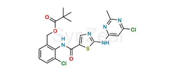 Dasatinib Impurity 15 is chemically 3-Chloro-2-(2-((6-chloro-2-methylpyrimidin-4-yl)amino)thiazole-5-carboxamido)benzyl pivalate. Dasatinib Impurity 15 is supplied with detailed characterization data compliant with regulatory guideline. Dasatinib Impurity 15 can be used for the analytical method development, method validation (AMV), Quality Controlled (QC) application for Abbreviated New Drug Application (ANDA) or during commercial production of Dasatinib.