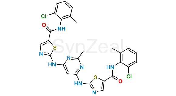 Dasatinib Impurity 30 is chemically 2,2'-((2-Methylpyrimidine-4,6-diyl)bis(azanediyl))bis(N-(2-chloro-6-methylphenyl)thiazole-5-carboxamide). Dasatinib Impurity 30 is supplied with detailed characterization data compliant with regulatory guideline. Dasatinib Impurity 30 can be used for the analytical method development, method validation (AMV), Quality Controlled (QC) application for Abbreviated New Drug Application (ANDA) or during commercial production of Dasatinib.