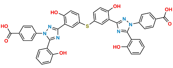 Deferasirox Sulfide Dimer Impurity is chemically 4,4'-((Thiobis(6-hydroxy-3,1-phenylene))bis(5-(2-hydroxyphenyl)-1H-1,2,4-triazole-3,1-diyl))dibenzoic acid. It is also known as Deferasirox Impurity E. Deferasirox Sulfide Dimer Impurity is supplied with detailed characterization data compliant with regulatory guideline. Deferasirox Sulfide Dimer Impurity can be used for the analytical method development, method validation (AMV), Quality Controlled (QC) application for Abbreviated New Drug Application (ANDA) or during commercial production of Deferasirox.