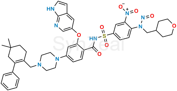 Deschloro Venetoclax Nitroso Impurity is chemically 2-((1H-pyrrolo[2,3-b]pyridin-5-yl)oxy)-4-(4-((5,5-dimethyl-3,4,5,6-tetrahydro-[1,1'-biphenyl]-2-yl)methyl)piperazin-1-yl)-N-((3-nitro-4-(nitroso((tetrahydro-2H-pyran-4-yl)methyl)amino)phenyl)sulfonyl)benzamide. Deschloro Venetoclax Nitroso Impurity is supplied with detailed characterization data compliant with regulatory guideline. Deschloro Venetoclax Nitroso Impurity can be used for the analytical method development, method validation (AMV), Quality Controlled (QC) application for Abbreviated New Drug Application (ANDA) or during commercial production of Venetoclax.