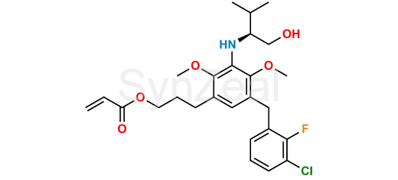 Elvitegravir Impurity 5 is chemically 2-(5-(3-Chloro-2-fluorobenzyl)-2, 4-dimethoxybenzyl)-3-{[(1S)-1-(hydroxy methyl)-2-methyl propyl] amino} ethyl acrylate. Elvitegravir Impurity 5 is supplied with detailed characterization data compliant with regulatory guideline. Elvitegravir Impurity 5 can be used for the analytical method development, method validation (AMV), Quality Controlled (QC) application for Abbreviated New Drug Application (ANDA) or during commercial production of Elvitegravir.