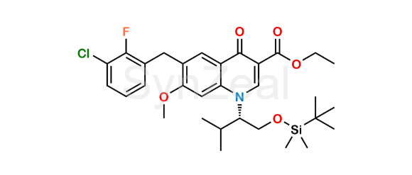 Elvitegravir Impurity 7 is chemically Ethyl (S)-1-(1-((tert-butyldimethylsilyl)oxy)-3-methylbutan-2-yl)-6-(3-chloro-2-fluorobenzyl)-7-methoxy-4-oxo-1,4-dihydroquinoline-3-carboxylate. Elvitegravir Impurity 7 is supplied with detailed characterization data compliant with regulatory guideline. Elvitegravir Impurity 7 can be used for the analytical method development, method validation (AMV), Quality Controlled (QC) application for Abbreviated New Drug Application (ANDA) or during commercial production of Elvitegravir.