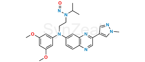 Erdafitinib Nitroso Impurity is chemically N-(2-((3,5-Dimethoxyphenyl)(3-(1-methyl-1H-pyrazol-4-yl)quinoxalin-6-yl)amino)ethyl)-N-isopropylnitrous amide. Erdafitinib Nitroso Impurity is supplied with detailed characterization data compliant with regulatory guideline. Erdafitinib Nitroso Impurity can be used for the analytical method development, method validation (AMV), Quality Controlled (QC) application for Abbreviated New Drug Application (ANDA) or during commercial production of Erdafitinib.