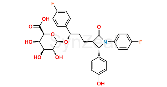 Ezetimibe Hydroxy Glucuronide is chemically (2S,3S,4S,5R,6R)-6-((S)-1-(4-fluorophenyl)-3-((2S,3R)-1-(4-fluorophenyl)-2-(4-hydroxyphenyl)-4-oxoazetidin-3-yl)propoxy)-3,4,5-trihydroxytetrahydro-2H-pyran-2-carboxylic acid. Ezetimibe Hydroxy Glucuronide is supplied with detailed characterization data compliant with regulatory guideline. Ezetimibe Hydroxy Glucuronide can be used for the analytical method development, method validation (AMV), Quality Controlled (QC) application for Abbreviated New Drug Application (ANDA) or during commercial production of Ezetimibe.