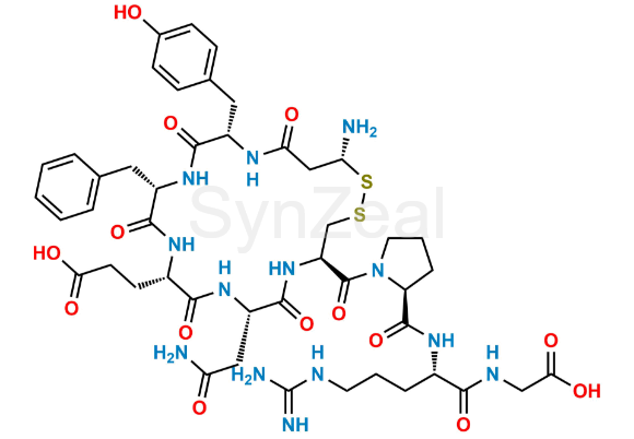 Glu (4)-Gly-OH-Vasopressin is chemically 3-((4R,7S,10S,13S,16S,20R)-20-amino-7-(2-amino-2-oxoethyl)-13-benzyl-4-((S)-2-(((S)-1-((carboxymethyl)amino)-5-guanidino-1-oxopentan-2-yl)carbamoyl)pyrrolidine-1-carbonyl)-16-(4-hydroxybenzyl)-6,9,12,15,18-pentaoxo-1,2-dithia-5,8,11,14,17-pentaazacycloicosan-10-yl)propanoic acid. Glu (4)-Gly-OH-Vasopressin is supplied with detailed characterization data compliant with regulatory guideline. Glu (4)-Gly-OH-Vasopressin can be used for the analytical method development, method validation (AMV), Quality Controlled (QC) application for Abbreviated New Drug Application (ANDA) or during commercial production of Vasopressin.
