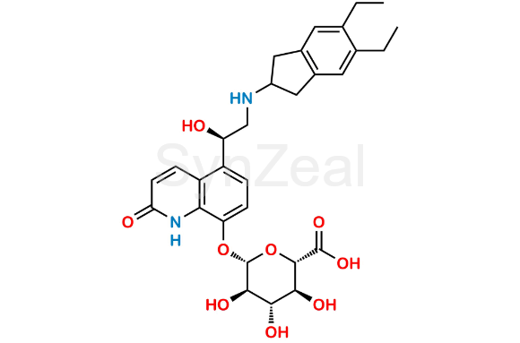 Indacaterol metabolite P37 is chemically (2S,3S,4S,5R,6S)-6-((5-((R)-2-((5,6-Diethyl-2,3-dihydro-1H-inden-2-yl)amino)-1-hydroxyethyl)-2-oxo-1,2-dihydroquinolin-8-yl)oxy)-3,4,5-trihydroxytetrahydro-2H-pyran-2-carboxylic acid. Indacaterol metabolite P37 is supplied with detailed characterization data compliant with regulatory guideline. Indacaterol metabolite P37 can be used for the analytical method development, method validation (AMV), Quality Controlled (QC) application for Abbreviated New Drug Application (ANDA) or during commercial production of Indacaterol.
