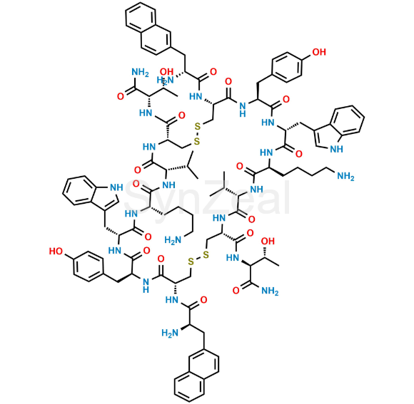 Lanreotide Anti-parallel Dimer is chemically (4R,7S,10S,13R,16S,19R,24R,27S,30S,33R,36S,39R)-13,33-bis((1H-indol-3-yl)methyl)-19,39-bis((R)-2-amino-3-(naphthalen-2-yl)propanamido)-N4,N24-bis((2S,3R)-1-amino-3-hydroxy-1-oxobutan-2-yl)-10,30-bis(4-aminobutyl)-16,36-bis(4-hydroxybenzyl)-7,27-diisopropyl-6,9,12,15,18,26,29,32,35,38-decaoxo-1,2,21,22-tetrathia-5,8,11,14,17,25,28,31,34,37-decaazacyclotetracontane-4,24-dicarboxamide. It is also known as Lanreotide Antiparallel Impurity. Lanreotide Anti-parallel Dimer is supplied with detailed characterization data compliant with regulatory guideline. Lanreotide Anti-parallel Dimer can be used for the analytical method development, method validation (AMV), Quality Controlled (QC) application for Abbreviated New Drug Application (ANDA) or during commercial production of Lanreotide.