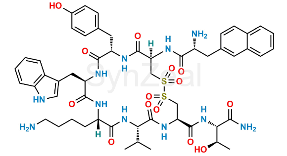 Lanreotide Disulfone Impurity is chemically (4R,7S,10S,13R,16S,19R)-13-((1H-Indol-3-yl)methyl)-19-((R)-2-amino-3-(naphthalen-2-yl)propanamido)-N-((2S,3R)-1-amino-3-hydroxy-1-oxobutan-2-yl)-10-(4-aminobutyl)-16-(4-hydroxybenzyl)-7-isopropyl-6,9,12,15,18-pentaoxo-1,2-dithia-5,8,11,14,17-pentaazacycloicosane-4-carboxamide 1,1,2,2-tetraoxide. Lanreotide Disulfone Impurity is supplied with detailed characterization data compliant with regulatory guideline. Lanreotide Disulfone Impurity can be used for the analytical method development, method validation (AMV), Quality Controlled (QC) application for Abbreviated New Drug Application (ANDA) or during commercial production of Lanreotide.