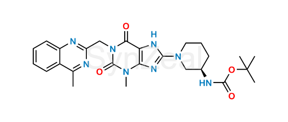 Linagliptin Impurity 23 is chemically Tert-butyl (R)-(1-(3-methyl-1-((4-methylquinazolin-2-yl)methyl)-2,6-dioxo-2,3,6,7-tetrahydro-1H-purin-8-yl)piperidin-3-yl)carbamate. Linagliptin Impurity 23 is supplied with detailed characterization data compliant with regulatory guideline. Linagliptin Impurity 23 can be used for the analytical method development, method validation (AMV), Quality Controlled (QC) application for Abbreviated New Drug Application (ANDA) or during commercial production of Linagliptin.