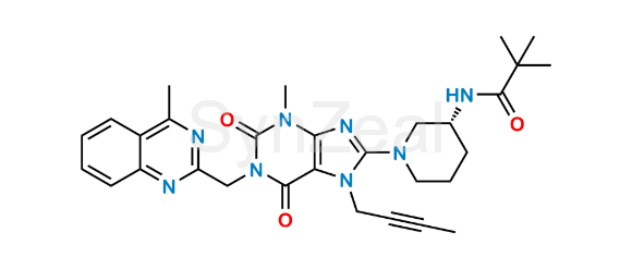 Linagliptin Impurity 31 is chemically (R)-N-(1-(7-(but-2-yn-1-yl)-3-methyl-1-((4-methylquinazolin-2-yl)methyl)-2,6-dioxo-2,3,6,7-tetrahydro-1H-purin-8-yl)piperidin-3-yl)pivalamide. Linagliptin Impurity 31 is supplied with detailed characterization data compliant with regulatory guideline. Linagliptin Impurity 31 can be used for the analytical method development, method validation (AMV), Quality Controlled (QC) application for Abbreviated New Drug Application (ANDA) or during commercial production of Linagliptin.