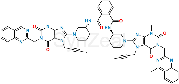 Linagliptin Impurity 36 is chemically N,N’-bis((R)-1-(7-(but-2-yn-1-yl)-3-methyl-1-((4-methylquinazolin-2-yl)methyl)-2,6-dioxo-2,3,6,7-tetrahydro-1Hpurin-8-yl)piperidin-3-yl)phthalamide. Linagliptin Impurity 36 is supplied with detailed characterization data compliant with regulatory guideline. Linagliptin Impurity 36 can be used for the analytical method development, method validation (AMV), Quality Controlled (QC) application for Abbreviated New Drug Application (ANDA) or during commercial production of Linagliptin.