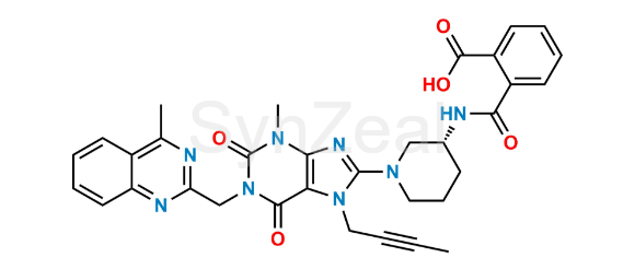 Linagliptin Impurity 37 is chemically (R)-2-((1-(7-(but-2-yn-1-yl)-3-methyl-1-((4-methylquinazolin-2-yl)methyl)-2,6-dioxo-2,3,6,7-tetrahydro-1Hpurin-8-yl)piperidin-3-yl)carbamoyl)benzoic acid. Linagliptin Impurity 37 is supplied with detailed characterization data compliant with regulatory guideline. Linagliptin Impurity 37 can be used for the analytical method development, method validation (AMV), Quality Controlled (QC) application for Abbreviated New Drug Application (ANDA) or during commercial production of Linagliptin.