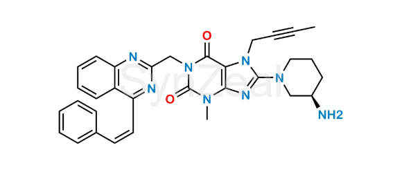 Linagliptin Impurity 78 is chemically (R,Z)-8-(3-Aminopiperidin-1-yl)-7-(but-2-yn-1-yl)-3-methyl-1-((4-styrylquinazolin-2-yl)methyl)-3,7-dihydro-1H-purine-2,6-dione. Linagliptin Impurity 78 is supplied with detailed characterization data compliant with regulatory guideline. Linagliptin Impurity 78 can be used for the analytical method development, method validation (AMV), Quality Controlled (QC) application for Abbreviated New Drug Application (ANDA) or during commercial production of Linagliptin.