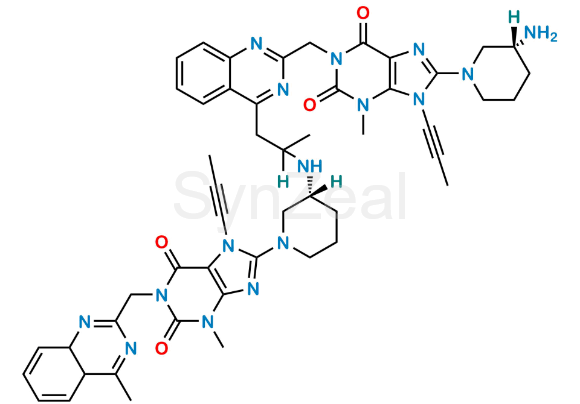 Linagliptin Impurity 98 is chemically 8-((R)-3-aminopiperidin-1-yl)-3-methyl-1-((4-(2-(((3R)-1-(3-methyl-1-((4-methyl-4a,8a-dihydroquinazolin-2-yl)methyl)-2,6-dioxo-7-(prop-1-yn-1-yl)-2,3,6,7-tetrahydro-1H-purin-8-yl)piperidin-3-yl)amino)propyl)quinazolin-2-yl)methyl)-9-(prop-1-yn-1-yl)-3,9-dihydro-1H-purine-2,6-dione. Linagliptin Impurity 98 is supplied with detailed characterization data compliant with regulatory guideline. Linagliptin Impurity 98 can be used for the analytical method development, method validation (AMV), Quality Controlled (QC) application for Abbreviated New Drug Application (ANDA) or during commercial production of Linagliptin.