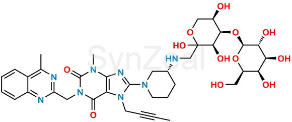 Linagliptin Lactose Adduct is chemically 7-(But-2-yn-1-yl)-3-methyl-1-((4-methylquinazolin-2-yl)methyl)-8-((3R)-3-((((3R,4R,5R)-2,3,5-trihydroxy-4-(((2S,3R,4S,5R,6R)-3,4,5-trihydroxy-6-(hydroxymethyl)tetrahydro-2H-pyran-2-yl)oxy)tetrahydro-2H-pyran-2-yl)methyl)amino)piperidin-1-yl)-3,7-dihydro-1H-purine-2,6-dione. Linagliptin Lactose Adduct is supplied with detailed characterization data compliant with regulatory guideline. Linagliptin Lactose Adduct can be used for the analytical method development, method validation (AMV), Quality Controlled (QC) application for Abbreviated New Drug Application (ANDA) or during commercial production of Linagliptin.