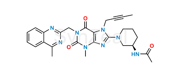 Linagliptin N-Acetyl Impurity is chemically ((R)-N-(1-(7-(but-2-yn-1-yl)-3-methyl-1-((4-methylquinazolin-2-yl)methyl)-2,6-dioxo-2,3,6,7-tetrahydro-1H-purin-8-yl)piperidin-3-yl)acetamide) (as per USP). Linagliptin N-Acetyl Impurity is supplied with detailed characterization data compliant with regulatory guideline. Linagliptin N-Acetyl Impurity can be used for the analytical method development, method validation (AMV), Quality Controlled (QC) application for Abbreviated New Drug Application (ANDA) or during commercial production of Linagliptin.