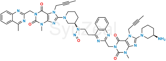 Linagliptin Nitroso Dimer Impurity 1 is chemically N-(2-(2-((8-((R)-3-aminopiperidin-1-yl)-7-(but-2-yn-1-yl)-3-methyl-2,6-dioxo-2,3,6,7-tetrahydro-1H-purin-1-yl)methyl)quinazolin-4-yl)ethyl)-N-((R)-1-(7-(but-2-yn-1-yl)-3-methyl-1-((4-methylquinazolin-2-yl)methyl)-2,6-dioxo-2,3,6,7-tetrahydro-1H-purin-8-yl)piperidin-3-yl)nitrous amide. Linagliptin Nitroso Dimer Impurity 1 is supplied with detailed characterization data compliant with regulatory guideline. Linagliptin Nitroso Dimer Impurity 1 can be used for the analytical method development, method validation (AMV), Quality Controlled (QC) application for Abbreviated New Drug Application (ANDA) or during commercial production of Linagliptin.
